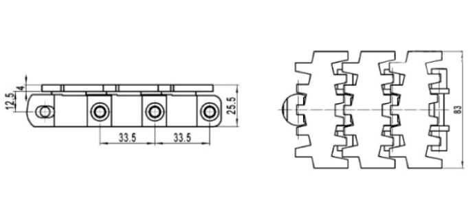 2.材質(zhì):鏈板材質(zhì):聚甲醛(POM),銷軸材質(zhì):冷軋奧氏體不銹鋼。
