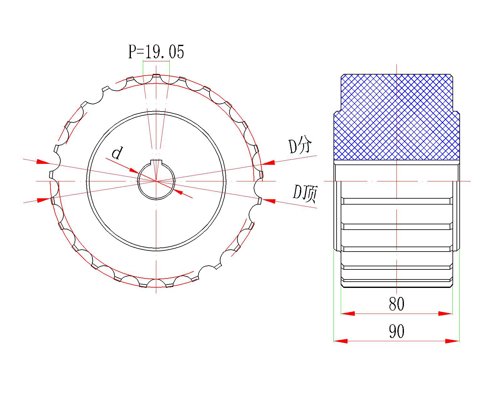 | 鏈輪型號 | 齒數 | D分(mm) | D頂(mm) | d孔徑(mm) |