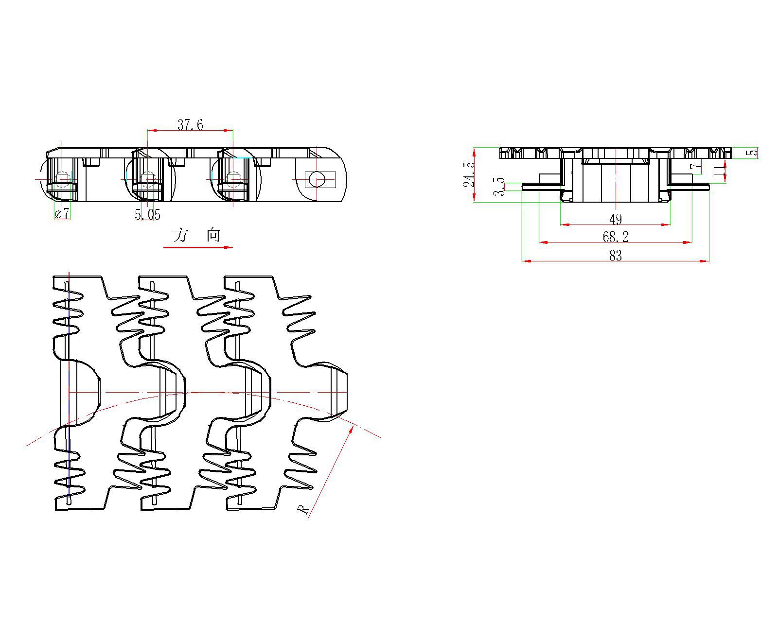 | 鏈條型號(hào) | 寬度(mm) | 重量(Kg/m) | 反向彎曲半徑 | 轉(zhuǎn)彎半徑 |