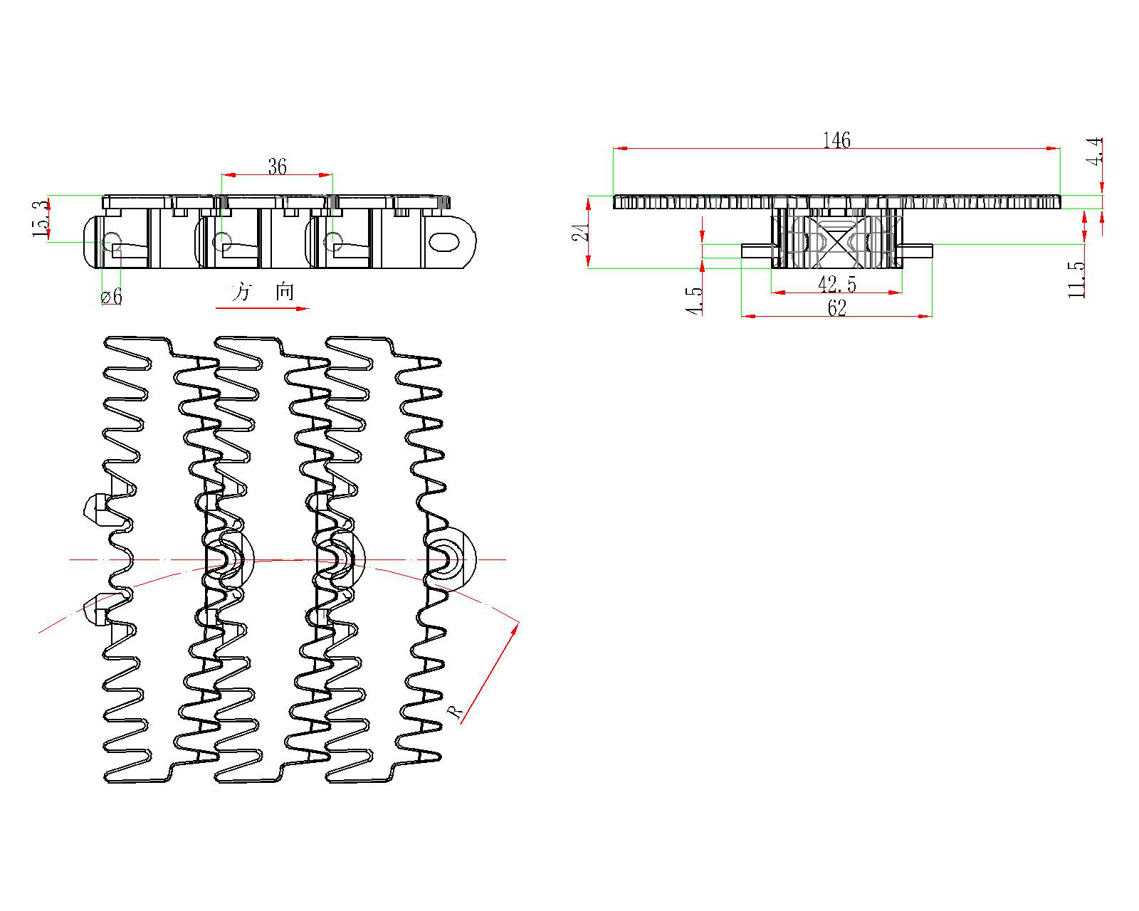 | 鏈條型號 | 寬度(mm) | 重量(Kg/m) | 反向彎曲半徑 | 轉彎半徑 |