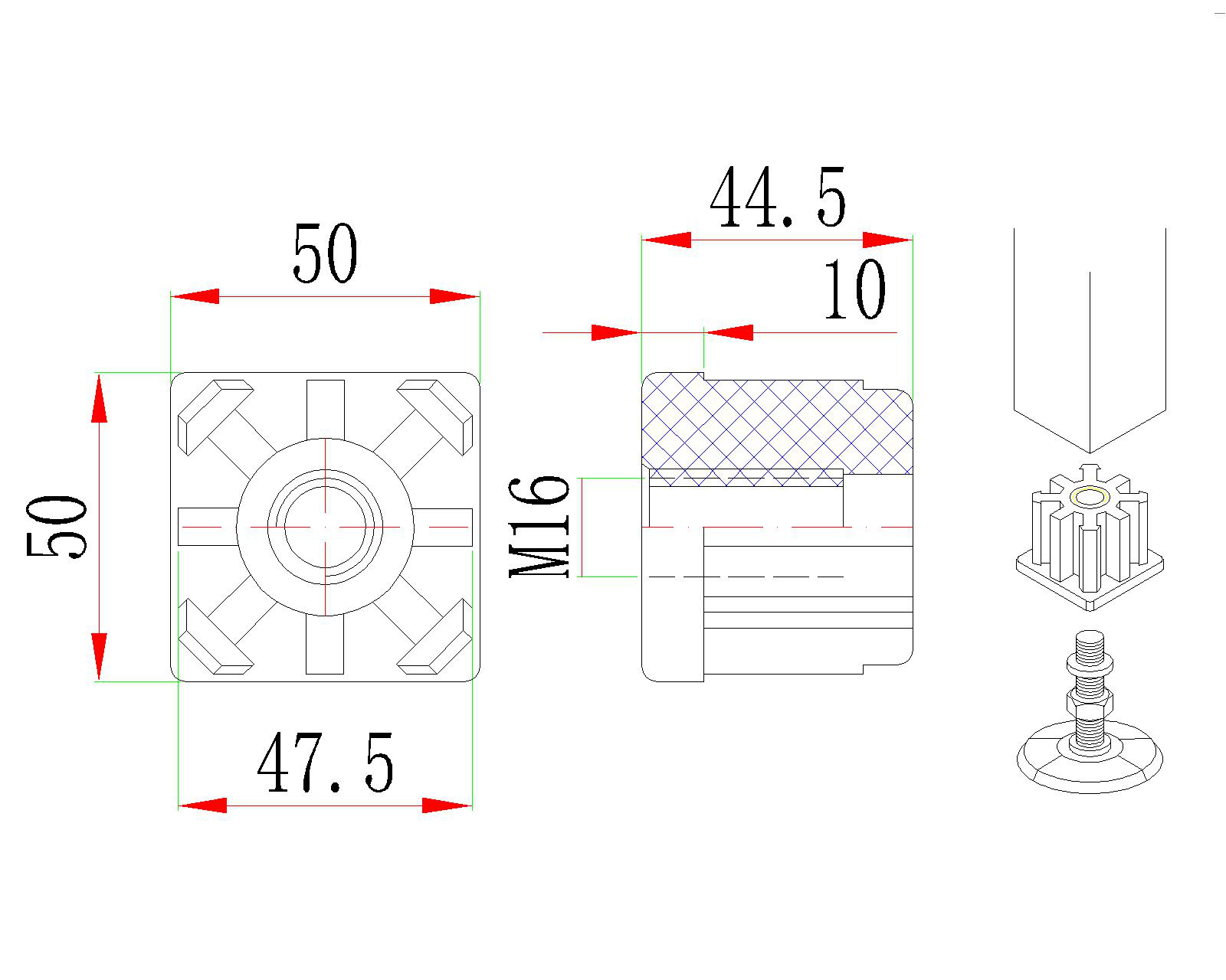 產(chǎn)品描述:尺寸參數(shù) 型號規(guī)格 型號 名稱 材質(zhì) 顏色 P852 方管腳螺母 加強尼龍 黑色 方管腳螺母配50*50*1方管
