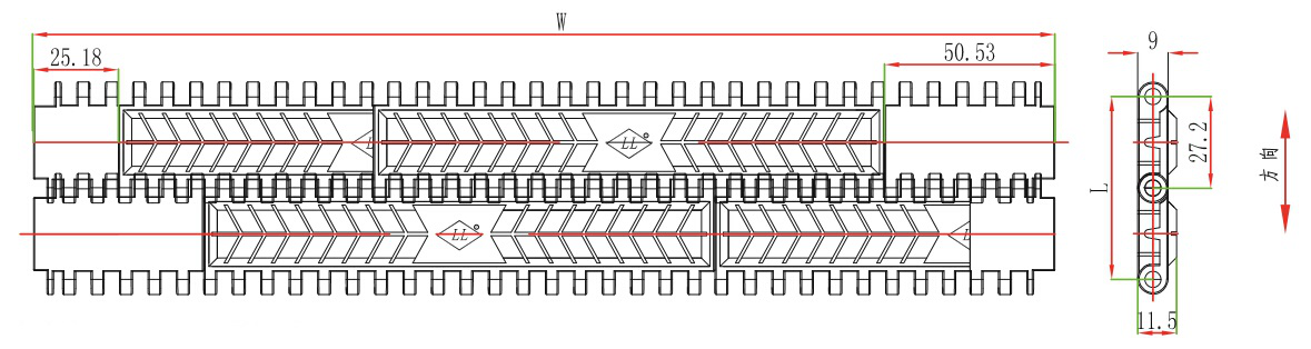 7.適用范圍:主要適合應(yīng)用在中節(jié)距輸送系統(tǒng)、中尺寸中壓力的罐、盒、瓶等包裝機輸送帶